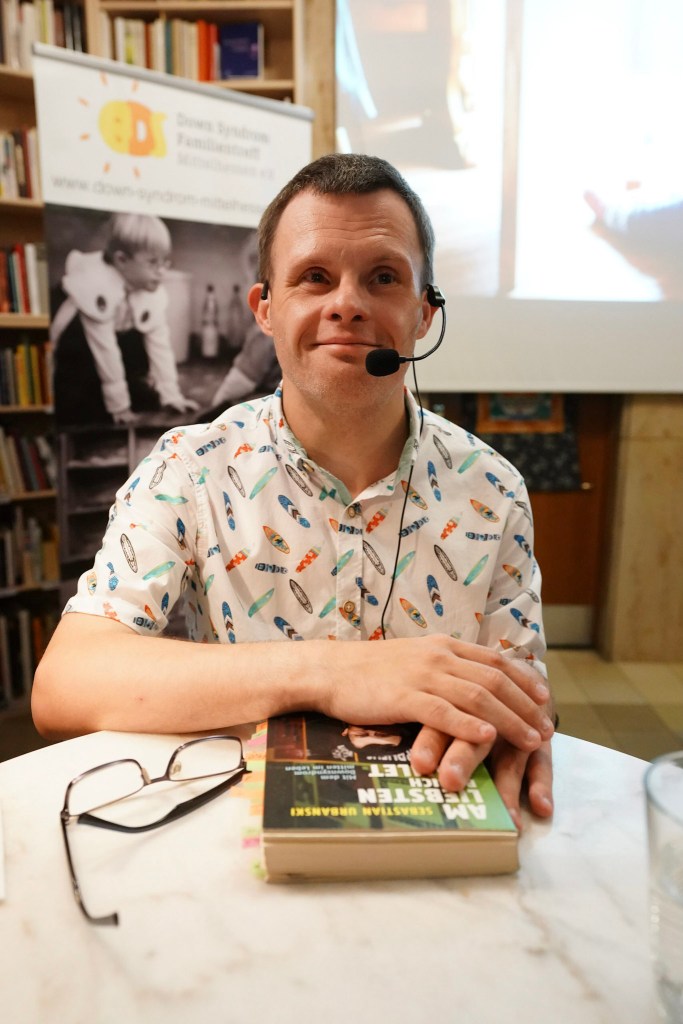 In seinem autobiographischen Buch „Am liebsten bin ich Hamlet. Mit dem Downsyndrom mitten im Leben.“ erzählte Sebastian Urbanski von dem Bemühen seiner Eltern, ihm alle die Dinge beizubringen, die Kinder in ihrer jeweiligen Entwicklungsphase können müssten. Er berichtet mit einem Augenzwinkern von Situationen aus dem Alltagsleben mit einem Kind mit Downsyndrom, in denen sich die einen oder anderen Eltern im Publikum wieder fanden. Viel Schmunzeln, Lachen aber auch Nachdenkliches begleitete die Lesung. Urbanski berichtete von seinem Beruf als Schauspieler und der Angst respektlos und abfällig behandelt zu werden.